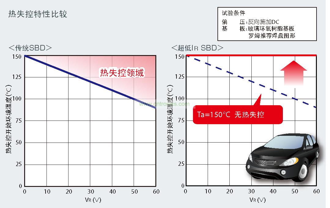 此次,羅姆通過(guò)采用最適合高溫環(huán)境的金屬,實(shí)現(xiàn)了業(yè)界頂級(jí)低IR化。與傳統(tǒng)的SBD相比,IR降低到約1/100,使高溫環(huán)境下的使用成為可能。