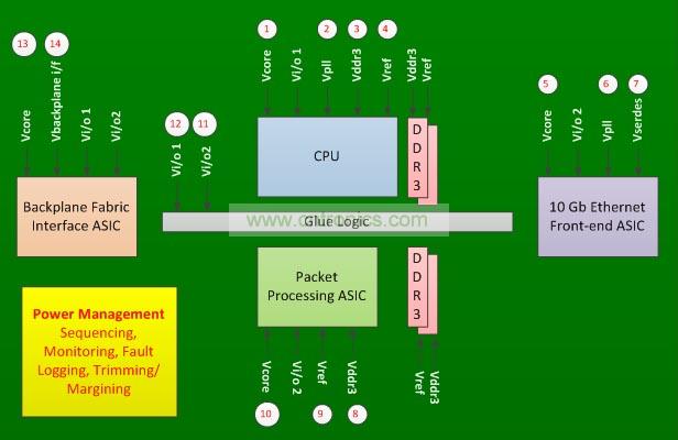 在圖1所示的線卡中,有四個主要的集成電路和一些粘合邏輯。每個集成電路都需要多個電源,并有定序的要求。這塊電路板有14個電源電壓,需要進(jìn)行監(jiān)測、定序、微調(diào)和裕度調(diào)整。此外,電路板的設(shè)計還需要將任何意想不到的電源故障記錄在非易失性存儲器中。