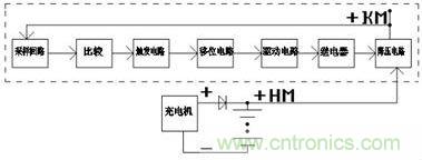 如圖2圖3示 ,合閘母線(+HM)經過硅降壓回路降壓后,形成正控制母線(+KM),+KM經自動調壓回路采樣后,采樣值送到比較判斷回路,在此處進行比較。如果+KM沒有高于預先設好的范圍,則觸發電路不動作。移位執行電路也不動作,相應的繼電器也不動,電路保持原狀態,+KM值保持不變,如果+KM超出了預先設好的范圍,則比較判斷回路發出信號,告之觸發電路,觸發電路立即發出脈沖,觸發移位寄存器,移位寄存器開始向左或向右執行移位,從而使電路驅動繼電器動作。繼電器相應的節點打開或閉和,來實現硅二極管是串入還是脫離+KM回路,于是實現+KM按電力標準規定的范圍內變化,從而實現了自動調節+KM電壓。