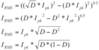 下面是輸入電容中RMS電流的推導過程,其假設電感無窮大。它以矩形脈沖(D0.5*Ipk)的RMS電流作為開始,并去除了DC組件(D*Ipk)。