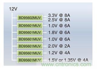 最近的高端FPGA(此次AVNET Internix公司的開發套件為Xilinx Kintex-7用),由于其制程工藝的微細化以及與其相應的低電壓化、內核部與接口部的電源分離以及數字電路與模擬電路的混裝等多電源化,必然需要先進的電源管理。電壓精度當然要求低波紋,而且要求具備投入時序管理和優異的負載瞬態響應性能。圖3為ROHM電源模塊的輸出結構,表示生成上述項目的各開關穩壓控制器與電壓/電流。