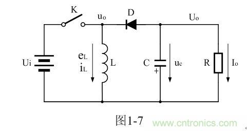 圖1-7中,Ui為輸入電源,K為控制開關(guān),L為儲(chǔ)能電感,D為整流二極管,C為儲(chǔ)能濾波電容,R為負(fù)載電阻。當(dāng)控制開關(guān)K接通的時(shí)候,輸入電源Ui開始對儲(chǔ)能電感L加電,流過儲(chǔ)能電感L的電流開始增加,同時(shí)電流在儲(chǔ)能電感中也要產(chǎn)生磁場;當(dāng)控制開關(guān)K由接通轉(zhuǎn)為關(guān)斷的時(shí)候,儲(chǔ)能電感會(huì)產(chǎn)生反電動(dòng)勢,使電流繼續(xù)流動(dòng),并通過整流二極管D進(jìn)行整流,再經(jīng)電容儲(chǔ)能濾波,然后向負(fù)載R提供電流輸出。控制開關(guān)K不斷地反復(fù)接通和關(guān)斷過程,在負(fù)載R上就可以得到一個(gè)負(fù)極性的電壓輸出。