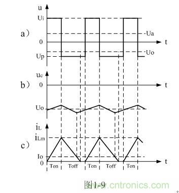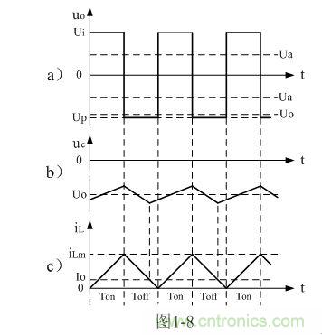 圖1-8、圖1-9、圖1-10分別是控制開關(guān)K的占空比D等于0.5、< 0.5、> 0.5時(shí),圖1-7電路中幾個(gè)關(guān)鍵點(diǎn)的電壓和電流波形。圖1-8-a)、圖1-9-a)、圖1-10-a)分別為控制開關(guān)K輸出電壓uo的波形;圖1-8-b)、圖1-9-b)、圖1-10-b)分別為儲(chǔ)能濾波電容兩端電壓uc的波形;圖1-8-c)、圖1-9-c)、圖1-10-c)分別為流過儲(chǔ)能電感L電流iL的波形。應(yīng)該特別注意的是,圖1-8-c)、圖1-9-c)、圖1-10-c)中的電流波形按原理應(yīng)該取負(fù)值,但取負(fù)值后反而覺得與前面圖1-5與圖1-6不好對比和分析,因此,當(dāng)進(jìn)行具體計(jì)算時(shí),一定要注意電流和電壓的方向。
