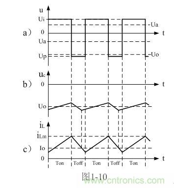 順便指出,反轉(zhuǎn)式串聯(lián)開關(guān)電源輸出電壓為負(fù)脈沖,當(dāng)圖1-7中的濾波電容器C開路時(shí),負(fù)脈沖的幅度將非常高,負(fù)脈沖是一個(gè)幅度按指數(shù)規(guī)律下降的尖脈沖,其幅度主要由負(fù)載電阻的大小,以及占空比來決定;當(dāng)圖7中的濾波電容器C接入后,反轉(zhuǎn)式串聯(lián)開關(guān)電源輸出電壓uo為一負(fù)方波,此方波我們可稱之為半波平均值,關(guān)于半波平均值的概念我們后面還會(huì)詳細(xì)解釋。