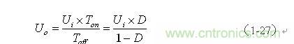 由(1-27)式可以看出,反轉(zhuǎn)式串聯(lián)開關(guān)電源輸出電壓與輸入電壓與開關(guān)接通的時(shí)間成正比,與開關(guān)關(guān)斷的時(shí)間成反比,而與儲(chǔ)能電感L的大小無關(guān);與儲(chǔ)能電感L有關(guān)的是輸出電流的大小,電流的大小隱含在(1-21)、(1-25)、(1-26)式中。