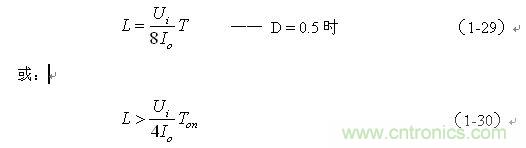 (1-29)和(1-30)式,就是計(jì)算反轉(zhuǎn)式串聯(lián)開關(guān)電源中儲(chǔ)能電感的公式。同理,(1-29)和(1-30)式的計(jì)算結(jié)果,只給出了計(jì)算反轉(zhuǎn)式串聯(lián)開關(guān)電源儲(chǔ)能電感L的中間值,或平均值,由于輸出電流的不確定性,實(shí)際應(yīng)用時(shí),可以以此為極限,在此平均值的計(jì)算結(jié)果上再乘以一個(gè)大于1的系數(shù)。