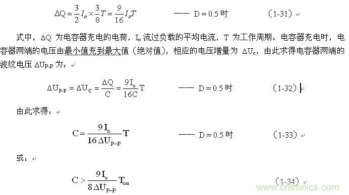 (1-33)和(1-34)式,就是計(jì)算反轉(zhuǎn)式串聯(lián)開關(guān)電源儲(chǔ)能濾波電容的公式(D = 0.5時(shí))。式中:Io是流過負(fù)載電流的平均值,T為開關(guān)工作周期,ΔUP-P為濾波輸出電壓的波紋。一般波紋電壓都是取峰-峰值,因此,當(dāng)D = 0.5時(shí),波紋電壓正好等于電容器充電的電壓增量,即:ΔUP-P = ΔUc 。