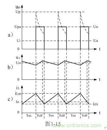 圖2-13-a、圖2-14-a、圖2-15-a分別為開關電源工作于臨界電流連續、電流不連續、電流連續狀態時,圖2-12-a電路中各點的電壓、電流波形。圖2-13-b、圖2-14-b、圖2-15-b分別為3種狀態之下,濾波電容兩端的紋波電壓波形。圖2-13-c、圖2-14-c、圖2-15-c分別為3種狀態之下,流過儲能電感的電流波形。不過,圖中這些波形相對來說還是比較粗略和簡單的,如需要對它們更嚴密的表達和分析,請參考后面圖1-24和圖1-25相關的內容。