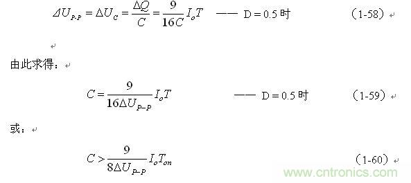 同理,(1-59)和(1-60)式的計算結果,只給出了計算并聯式開關電源儲能濾波電容C的中間值,或平均值,對于極端情況可以在平均值的計算結果上再乘以一個大于1的系數。
