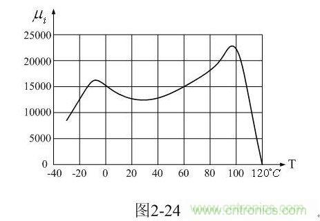 順便說(shuō)明,圖2-24中的初始導(dǎo)磁率 一般是用磁環(huán)作為樣品測(cè)試得到的,測(cè)試信號(hào)的頻率一般比較低,僅為10kHz,并且測(cè)試時(shí)一般都選用最大導(dǎo)磁率作為結(jié)果;因此,實(shí)際應(yīng)用中的開(kāi)關(guān)變壓器鐵芯的導(dǎo)磁率并沒(méi)有這么高。