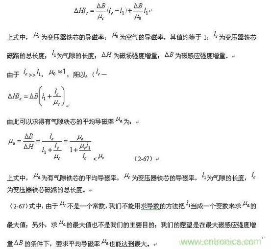 最大值的條件;當(dāng)然是氣隙長(zhǎng)度越小,平均導(dǎo)磁率 就越大。但在實(shí)際工作中, 的值要小于此值,因?yàn)椋瑢?duì)氣隙長(zhǎng)度要預(yù)留一定的余量,變壓器鐵芯的工作點(diǎn)不可能讓永遠(yuǎn)工作在最佳值的邊沿;因此,實(shí)際工作中的變壓器鐵芯,其最大磁感應(yīng)強(qiáng)度增量和最大磁場(chǎng)強(qiáng)度增量都會(huì)超出(2-68)式給出條件的范圍;所以,由(2-68)式求出的氣隙長(zhǎng)度 也是最低極限值。