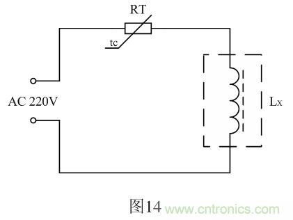開關(guān)變壓器退磁的最好的方法是讓開關(guān)變壓器初級線圈在非常短的時間內(nèi)通過一個幅度為3~5倍Imax(極限電流)的阻尼振蕩電流。因此,可用一個20~40歐姆的消磁熱敏電阻(可用兩個消磁熱敏電阻串聯(lián))與開關(guān)變壓器的初級線圈串聯(lián),然后接到110~220V/50Hz交流電源上,大約只需要20多秒鐘,待消磁熱敏電阻完全加熱后,即可達到退磁的目的,如圖14所示。在圖14中,RT為熱敏電阻,Lx為開關(guān)變壓器的初級線圈。