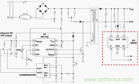 圖8 為基于Dialog 公司2014年初推出的iw620+iw1760的快速充電設(shè)計(jì)方案實(shí)物圖,電路的設(shè)計(jì)思路為iW620快速充電接口IC可以通過(guò)USB數(shù)據(jù)線檢測(cè)到支持Quick Charge 2.0的移動(dòng)設(shè)備發(fā)出的指令,然后與iW1760 PWM原邊控制器進(jìn)行通信,對(duì)電源適配器輸出電壓進(jìn)行配置。位于初級(jí)側(cè)的iW1760就可提供電流感應(yīng)。通過(guò)其可編程的主動(dòng)快速放電專利技術(shù)能將輸出電壓從9V或12V降至5V, 因此,當(dāng)用 戶拔掉連接Quick Charge 2.0手機(jī)的USB數(shù)據(jù)線,再將其連接至非Quick Charge 2.0手機(jī)時(shí),iW620可以迅速把輸出電壓降至5V,避免對(duì)其造成損壞。