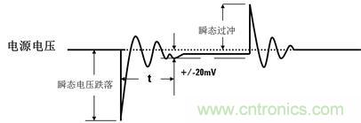 大部分直流電源的瞬態電壓過沖或跌落幅度不被表征或定義, 這是由于該參數很大程度上取決與負載的特性。 通常情況下,這個值會小于1V。 但市面上有些電源的瞬態響應時間過長,如果處理不好,在負載、電源及導線共同影響下, 過沖電壓可能會達到1-4V。