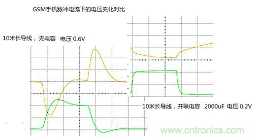 在加入電容后,對提升電路的瞬態響應能力,往往會起到比較明顯的效果。如圖4所示的,我們在用一個通用電源測量GSM手機脈沖電流,在沒有并聯電容的時候,瞬間電源跌落會達到0.6V (見圖4左). 對于一個工作在3.8V的手機來說,這樣大的電源跌落足以造成手機自動關機。當我們并聯了一個2000uF的電容后,電源跌落降到了0.2V以下,得到明顯改善,見圖4右所示(圖中,黃色曲線為電壓,綠色曲線為電流)。