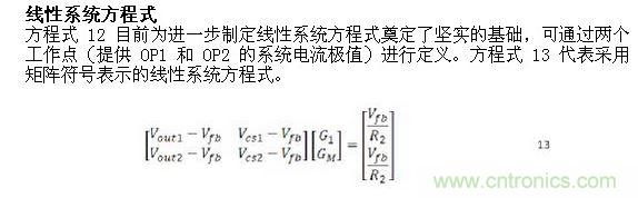 Vcs1 和 Vcs2 可通過方程式 4 確定。請選擇 R2 的值。最佳實(shí)踐是選擇已經(jīng)存在于電源設(shè)計(jì)中的值,因?yàn)檫@有助于確保網(wǎng)絡(luò)穩(wěn)定性。轉(zhuǎn)換器的反饋電壓 Vfb 可在穩(wěn)壓器產(chǎn)品說明書中找到。這樣我們可手動或用數(shù)學(xué)工具解算線性系統(tǒng)方程式,結(jié)果就是 G1 和 GM 電導(dǎo)值。反過來,其結(jié)果就是 R1 和 RM。