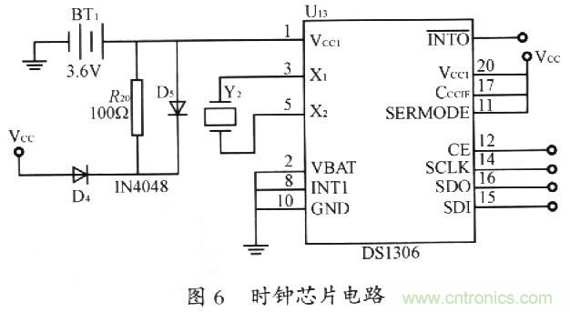 采用功能齊全的時鐘芯片DS1306。DS1306的時間、日歷和報警器可以通過寫相應的寄存器位來設置和初始化。通過讀相應寄存器就可獲得日歷和時間。DSl306的電源供給有三種運行方式,本系統采用可充電電池的方式,如圖6所示。