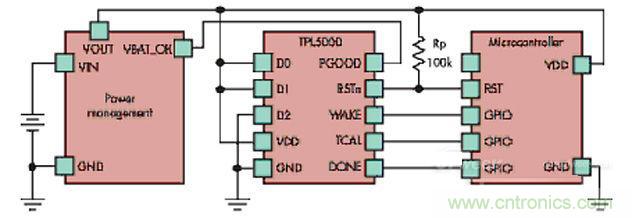 新式解決方案采用針對長休眠期特制的定時裝置,德州儀器TPL5000具備可編程分配器,提供最高間隔64秒的蘇醒脈沖,運(yùn)作時用電量僅30nA,在極長休眠周期下,最多能為電池供電的無線傳感器延長兩年使用年限。(請見下圖)