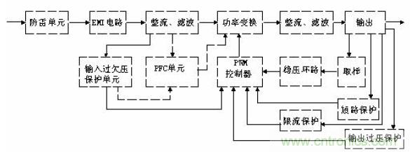 開關電源的主要電路是由輸入電磁干擾濾波器(EMI)、整流濾波電路、功率變換電路、PWM控制器電路、輸出整流濾波電路組成。輔助電路有輸入過欠壓保護電路、輸出過欠壓保護電路、輸出過流保護電路、輸出短路保護電路等。開關電源的電路組成方框圖如下: