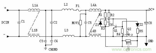 ② R1、R2、R3、Z1、C6、Q1、Z2、R4、R5、Q2、RT1、C7組成抗浪涌電路。在起機的瞬間,由于C6的存在Q2不導通,電流經RT1構成回路。當C6上的電壓充至Z1的穩壓值時Q2導通。如果C8漏電或后級電路短路現象,在起機的瞬間電流在RT1上產生的壓降增大,Q1導通使Q2沒有柵極電壓不導通,RT1將會在很短的時間燒毀,以保護后級電路。