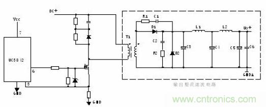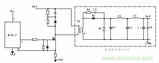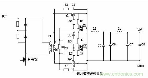 T1為開關變壓器,其初極和次極的相位同相。D1為整流二極管,D2為續流二極管,R1、C1、R2、C2為削尖峰電路。L1為續流電感,C4、L2、C5組成π型濾波器。
