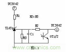 當輸出U0升高,經取樣電阻R7、R8、R10、VR1分壓后,U1③腳電壓升高,當其超過U1②腳基準電壓后U1①腳輸出高電平,使Q1導通,光耦OT1發光二極管發光,光電三極管導通,UC3842①腳電位相應變低,從而改變U1⑥腳輸出占空比減小,U0降低。