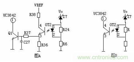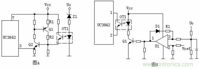 圖A的工作原理是,當輸出電壓Uo升高,穩壓管導通,光耦導通,Q2基極得電導通,由于Q2的導通Q1基極電壓降低也導通,Vcc電壓經R1、Q1、R2使Q2始終導通,UC3842③腳始終是高電平而停止工作。在圖B中,UO升高U1③腳電壓升高,①腳輸出高電平,由于D1、R1的存在,U1①腳始終輸出高電平Q1始終導通,UC3842①腳始終是低電平而停止工作。正反饋?