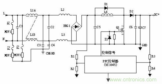 輸入電壓經L1、L2、L3等組成的EMI濾波器,BRG1整流一路送PFC電感,另一路經R1、R2分壓后送入PFC控制器作為輸入電壓的取樣,用以調整控制信號的占空比,即改變Q1的導通和關斷時間,穩定PFC輸出電壓。L4是PFC電感,它在Q1導通時儲存能量,在