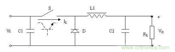 開關電源就是采用功率半導體器件作為開關元件,通過周期性通斷開關,控制開關元件的占空比來調(diào)整輸出電壓。開關元件以一定的時間間隔重復地接通和斷開,在開關無件接通時輸入電源Vi通過開關S和濾波電路向負載RL提供能量,當開關S斷開時,電路中的儲能裝置(L1、C2、二極管D組成的電路)向負載RL釋放在開關接通時所儲存的能量,使負載得到連續(xù)而穩(wěn)定的能量。