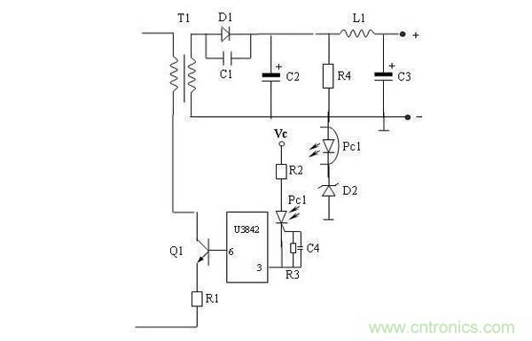經(jīng)檢查此開關電源采用U3842 PWM控制芯片,經(jīng)查找相關的資料得知,當U3842芯片的3端電壓高于1伏時,內(nèi)部電流敏感比較器輸出高電平,將PWM鎖存器復位使輸出關閉。通電測量U3842的3端高于1伏,6端無輸出,經(jīng)檢查相關電路,發(fā)現(xiàn)穩(wěn)壓管D2擊穿,如圖3,故PC1導通,致使U3842的3端為高電平,故6端無輸出,開關管不工作,直流側無直流輸出。更換同型號穩(wěn)壓管D2,故障解除。