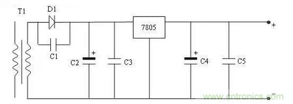 經(jīng)檢查,供光譜儀主板的直流5V電源僅剩2.3伏左右,脫開5V直流電源的負載,通電再次測量5V直流電源,這時則有5V,初步判斷此5V直流電源帶載能力差,拆開電源外殼進行檢修,由于沒有帶負載時,通電有直流5V輸出,故重點檢查次級線圈側的輸出整流電路,給5伏電源接上假負載通電進行測量發(fā)現(xiàn)三通穩(wěn)壓7805的1、2腳之間電壓為5.2伏,2、3腳之間卻剩2.3伏,如圖4,故判斷三通穩(wěn)壓管7805性能變壞,更換三通穩(wěn)壓管7805故障解決。