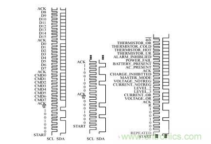 從圖4可見:89C51與MAX1647通信的開始條件是SDA端口為下降沿,同時SCL端口為高電平;MAX1647的 WRITE-WORD協(xié)議為0b00010010(0b表示二進(jìn)制),或者可表示為0x12(0x表示十六進(jìn)制);READ-WORD協(xié)議則可表示為 0b00010011或者0x13。另外,CMD0~CMD7代表具體的命令,D0~D15表示數(shù)據(jù)位。幾個常用的WRITE-WORD協(xié)議命令:ChargerMode()命令,命令代碼為0x12,主要用于清零和復(fù)位;ChargingVolage()命令,命令代碼為0x15,主要用于電壓預(yù)置;ChargingCurrent()命令,主要用于電流預(yù)置,命令代碼為0x14,即CMD7~CMD0的數(shù)據(jù)為00010100,16位二進(jìn)制數(shù)值由D15~D0組成表示Io的電流值,單位為mA。當(dāng)端子SEL與AGND短接時,電流Io的最大預(yù)置值為1.023A;如果讓端子SEL懸空,則 Io的最大預(yù)置值為2.047A;當(dāng)端子SEL與VL短接,則Io的最大預(yù)置值為4.095A。MAX1647提供兩個電流源給負(fù)載供電:一個來自內(nèi)部的線性電流源IOUT,一個是開關(guān)電路提供的電流。IOUT提供1mA~31mA的電流(步長為1mA)。例如,當(dāng)Io最大預(yù)置值為4.095A時,數(shù)據(jù)位 D11~D6對應(yīng)為6位電流預(yù)置DAC的DA5~DA0位;數(shù)據(jù)位D4~D0對應(yīng)輸出電流IOUT的I4~I(xiàn)0,表示IOUT線性電流源二進(jìn)調(diào)整數(shù)。注意任何時候DAC位被置位,線性電流源被調(diào)整至滿幅(31mA)。AlarmWarning()命令,命令代碼為0x16,主要用于保護(hù)設(shè)置;ChargerStatus()命令,命令代碼為0x13,主要用于返回溫度傳感器以及MAX1647的內(nèi)部信息,這些信息暫存D15~D0位中。