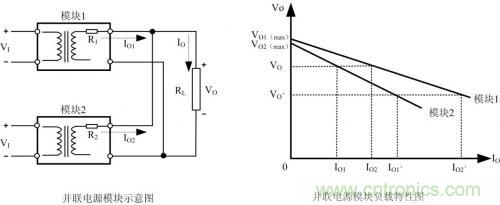 如果兩個模塊的參數(shù)完全相同時,即:VO1(max)= VO2(max)、R1=R2,則兩條負載特性曲線重合,能實現(xiàn)負載電流均勻分配。但在實際應用中,兩個具有相同容量的模塊,VO1(max)與VO2(max)、R1與R2的參數(shù)也不可能完全做到相同。從圖 2可以看出,由于輸出到負載RL的等效阻抗R1、R2很小,輸出電壓即便出現(xiàn)很小的差別也會引起輸出電流很大的變化。例如:當負載RL電流由IO= IO1+ IO2增大到IO、=IO1、+IO2、時,負載特性曲線斜率小的模塊1將承受大部分負載電流,模塊1將運行在滿載或過載限流狀態(tài),影響模塊的可靠性。