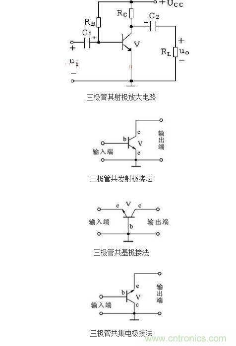 為了更進一步的說明這種三極管開關電路的設計原理,在這里我們以NPN三極管的共發射極放大電路為例,來具體的說明一下。下圖中所提供的三種連接方式是三極管放大電路最常見的,除了共發射極聯接方式外,還有共集電極和共基極聯接方式。