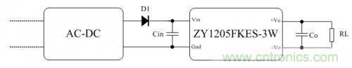 AC-DC電源模塊輸出電壓為12V,最大輸出電壓精度為±3%,那么輸出電壓范圍是11.64V~12.36V。而二極管D1使用1N4148,正向導通壓降為0.7V,那么ZY1205FKES-3W模塊實際輸入電壓的范圍只有為10.94V~11.66V,這個電壓范圍還是在ZY1205FKES-3W模塊的輸入電壓范圍內,模塊可以正常工作,只是輸出電壓會較低。