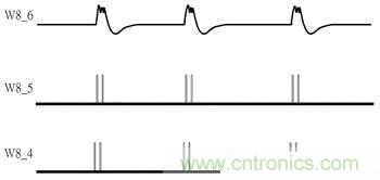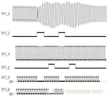 參照圖3錯動式訊號圖,W7_3為受電線圈訊號、W7_1與W7_2分別為P04與P11訊號、W7_4為S1訊號,其與W7_3不同在于通過一個C1電容之諧振效果后取得較強電流推力,其波形也會接近方波訊號;W7_5與W7_6分別為S12與S22訊號,從圖3中可看到設計中的調制訊號從線圈兩端分別進行調制,并分成調制單端、解除調制、調制另一單端后再解除調制完成,此設計的用意在于對受電線圈接收電力影響最小的情況下,產生最大調制訊號。