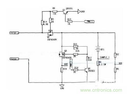 根據三路AD采樣結果確定充電器的充電狀態后,由單片機輸出兩路占空比可調頻率為1kHz的PWM波形PWM1和PWM2分別用來控制兩只三極管2N5551的導通程度,三極管集電極電流會隨著不同,再經電阻分壓后提供不同的電壓給場效應管的柵極,驅動MOSFET,輸出不停大小的漏極電流Id,給蓄電池提供大小不等的充電電流和放電脈沖幅值,最終達到脈沖充電的效果。