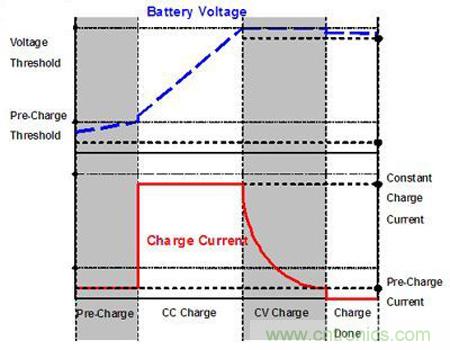 當(dāng)電池充電電壓上升至約3伏特時,充電器改以最大充電電流對電池進行定電流充電,此時電池電壓持續(xù)上升。