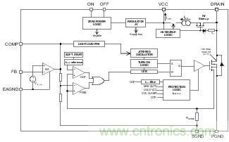 VIPer0P內部功能集成度很高,有助于設計人員設計一款輕巧的電源,同時節省組件成本。