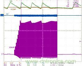 新的脈沖跨周調制模式保護功能可避免漏極電流過高和變壓器飽和,這兩種現象在轉換器啟動階段特別常見(圖5中的虛線),因為當輸入和輸出電壓差值很大時,電壓時間開始失衡,如果不加以控制,IDRAIN將會迅速升高。