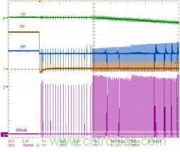 再按下開關時,ON引腳被強制連至SGND引腳,且連接時間大于DEB_ON,芯片退出零功耗模式。芯片通過軟啟動恢復開關操作,重新開始輸出功率。在實際應用中,ON和OFF引腳可以由微控制器控制,如圖3所示。實際上,這些引腳的上拉電阻有幾微安的驅動能力,可在零功耗模式供給微控制器。