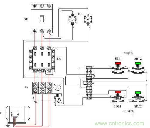 異地控制電動機時,只需要注意,停止按鈕全部串聯,啟動按鈕全部并聯即可。