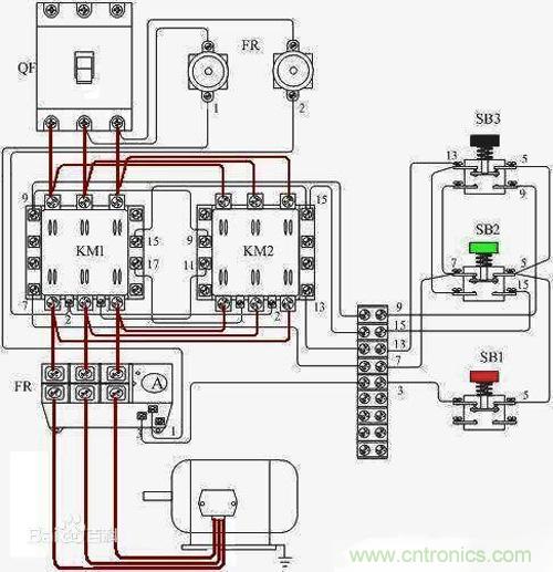 這里出現了一個問題,就是如果同時按下SB2和SB3或在電動機正轉的時候按下SB3,就會造成短路事故。因此我們在電路中接入了接觸器常閉觸點。在正轉的控制回路中接入KM2的常閉觸點,而在反轉的控制回路中接入KM1的常閉觸點。這樣以來,當電動機正轉時,由于接觸器KM1的線圈通電,因此常閉觸點KM1是斷開狀態,因此就算此時按下按鈕SB3,也不會有任何反應。