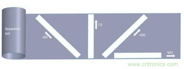 具體實驗過程如下,首先將參與測試的隔膜材料根據(jù)ASTM針對薄膜材料的D882規(guī)范的要求,制成了具有規(guī)則形狀的長條形試樣,拉伸實驗采用Instron 5944單向拉力機(jī)進(jìn)行測試,拉力加載速度為25mm/min。測試結(jié)果發(fā)現(xiàn),干法工藝制備的PE隔膜和三層復(fù)合隔膜在各個方向的抗拉強(qiáng)度上有很大的差距,例如在縱向MD上,抗拉強(qiáng)度>120MPa,在橫向TD和對角線方向上僅>20MPa。而濕法工藝制備的隔膜在各個方向上具有相似的抗拉強(qiáng)度(>140MPa),而無紡布工藝制備的隔膜的抗拉強(qiáng)度最差(<35MPa),無紡布隔膜在縱向和橫向具有相似的強(qiáng)度,但是對角線方向抗拉強(qiáng)度要明顯弱很多。