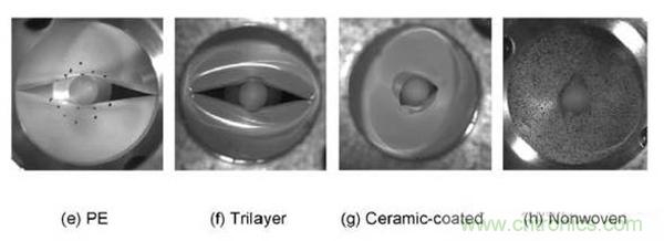 穿刺強(qiáng)度實驗發(fā)現(xiàn),干法工藝制備的PE隔膜和三層復(fù)合隔膜會在沿著縱向的方向上出現(xiàn)一個較長的裂縫,而對于濕法工藝和無紡布工藝隔膜,失效多數(shù)只出現(xiàn)在局部,并且呈現(xiàn)圓形破口。