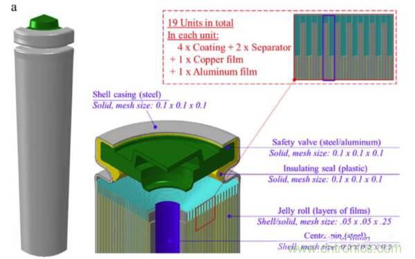 18650電池主要由三部分組成:安全閥、卷芯和低碳鋼外殼。安全閥通常由正溫度系數材料、鋁安全閥和不銹鋼正極端子、氣體密封墊等組成,電芯由正極、負極和隔膜組成,在本試驗中正極的活性物質的成分為LiCoO2。軸向載荷的加載速度為5mm/min,所有的試驗電池在試驗之前都已經完全放電(SOC=0)。測試結果顯示,18650電池在軸向壓力測試中壓力呈現出緩慢上升——快速上升——輕微下降——快速上升的趨勢,而電壓測試顯示,18650電池在變形達到4mm的情況下才會發生失效,而且通過試驗發現,18650電池的電壓突降主要是由于電池內部短路造成的,而不是內部結構的斷路。為了研究18650在軸向壓力下失效的機理,Juner Zhu還利用有限元軟件對其進行了分析,模型中的材料主要采用了彈塑性模型,并且考慮了各種材料的各向異性的特點,模型中包涵了上百萬的計算單元,軸向載荷的加載速度被設置為1m/s。
