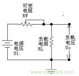 Uo=Ui×RL/(RW+RL),因此通過調節RW的大小,即可改變輸出電壓的大小。請注意,在這個式子里,如果我們只看可調電阻RW的值變化,Uo的輸出并不是線性的,但如果把RW和RL一起看,則是線性的。還要注意,我們這個圖并沒有將RW的引出端畫成連到左邊,而畫在右邊。雖然這從公式上看并沒有什么區別,但畫在右邊,卻正好反映了“采樣”和“反饋”的概念----實際中的電源,絕大部分都是工作在采樣和反饋的模式下的,使用前饋方法很少,或就是用了,也只是輔助方法而已。
