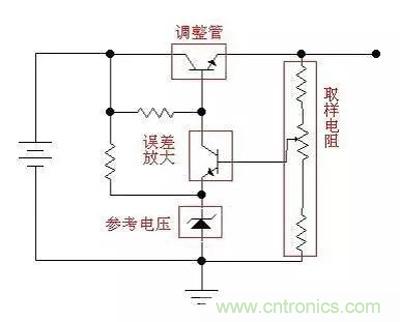 讓我們繼續:如果我們用一個三極管或者場效應管,來代替圖中的可變阻器,并通過檢測輸出電壓的大小,來控制這個“變阻器”阻值的大小,使輸出電壓保持恒定,這樣我們就實現了穩壓的目的。這個三極管或者場效應管是用來調整電壓輸出大小的,所以叫做調整管。