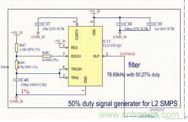 前級電源屬于典型定壓設計,無需給出設計原理,本文重點介紹后級半橋電路。具體原理圖見圖2和圖3。圖2為采用汽車級定時器電路設計的50%占空比信號發(fā)生器,用于給半橋開關電源提供控制信號,其中R49可以用來調(diào)整開關頻率,一般可以設定在70kHz到300kHz之間,頻率選擇主要根據(jù)電路板實際空間尺寸和變壓器的伏秒積進行折衷選取。