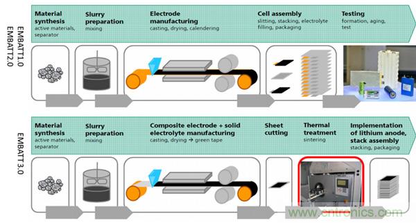 在制造工藝方面,1.0和2.0的制造工藝與現行的鋰離子電池制造工藝沒有明顯區別,在3.0上,由于采用全固態玻璃陶瓷電解液,因此電極和電解質的裝配可以在同一步驟完成,省卻了后面的注液環節,但是后續增加了熱處理環節,主要是為了讓電極和固態電解質界面更好的接觸。這3.0項目上,全固態電解質的開發、電解質與電極界面兼容性問題是重點研究內容,這與一般的固態電池的研究課題是一致的。